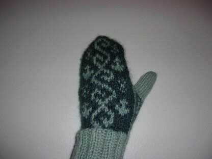 Both mittens have their own colored chart as the fronts of the hand patterns are not identical.