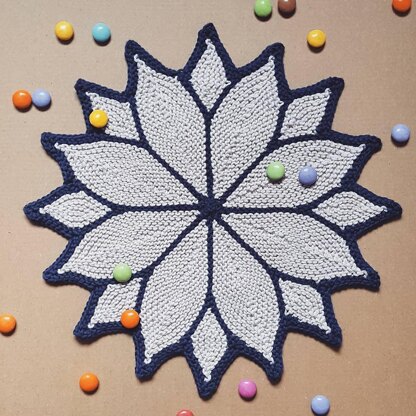 This is a pattern for a potholder or doily in a flower shape. I called it windrose, because the petals look a bit like the points of a compass. It starts with a provisional CO, is knitted in short row parts and finished with grafting in garter stitch.