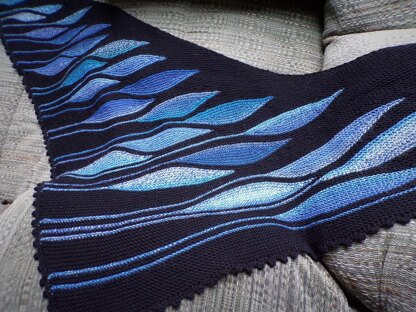 The asymmetrical shawl is shaped through simple increase (kfb) and decreased (k2tog) on both the right and left edge of knitting. Beginning at the smaller end, the leaves grow in size as the width of the shawl also increased. In all, 6 different sized leaves. The crocheted picot edge is added on agter the shawl is knit.