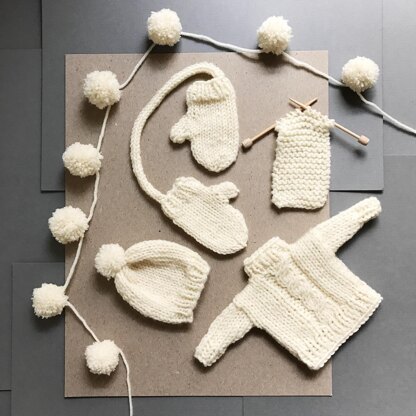 Cozy up your tree this year with some essential winter knitwear! A mini scarf-in-progress, cute little pompom hat, teeny sweater, and itty bitty mittens on a string will look so charming hanging from the branches alongside a garland of pompoms. Pattern contains instructions for all 5 items.