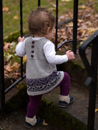 Winter Garden is a little girls’ woolen jumper with a stranded colorwork motif to brighten the winter landscape. Worked at a fine gauge in a woolen-spun 2-ply wool, the jumper is light but warm, beautiful enough for festive occasions but not too precious for puddle stomping. The details in this design make it at least an adventurous intermediate-level project, and even expert knitters will have the chance to practice unfamiliar techniques like the Channel Islands cast-on and Anna Zilboorg’s “perfect buttonholes,” which lend heirloom quality and durability to the jumper. Suggestions are given for substituting simpler techniques, should you desire to do so.