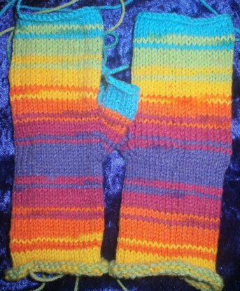 ***Cosy mitts in warm and funky summer rainbow colours using an easy knit acrylic DK selfstriping yarn. ***