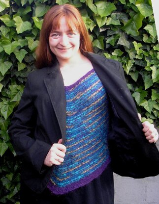 Soft as rippling clouds in the winter sky, Winter Ripples is the perfect ultra lightweight super-warm layering piece. The minimal finishing and large gauge make it practically fly off your needles for instant gratification knitting or last-minute gifts. The simplicity makes for great beginner or TV knitting, but the single-row striping and seed stitch edging adds enough interest to stave off boredom. This top works beautifully as a curve-cuddling undershirt, or wear it as an extra-warm shell or a vest. The tails in the front and back can tuck in securely to discourage waistline drafts.