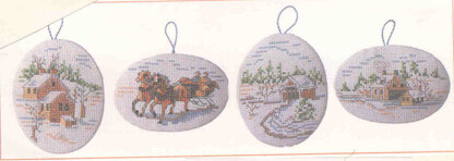 By Nancy Rossi. Four winter scenes are depicted in these special ornaments. They are reminiscent of Currier and Ives designs from long ago. This charming set will look beautiful on a holiday tree.