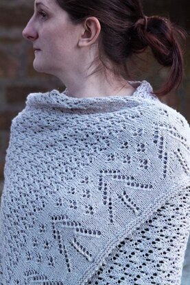 This is a rectangular shaped shawl, worked in two pieces, from the edges into the centre. Casting on requires using a Beaded Cast On method and casting off is achieved using a Three Needle Cast Off. Instructions for this shawl are provided in both written and charted format.