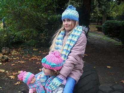 This pattern started life as a request from my niece for a 'Troll hat' -but I was unhappy with the ornamental designs available which were not practical on a cold walk to school. So after several messages back and forth to confirm what a decerning young lady considered the essential features of a 'troll hat', I designed a hat with a pattern of chain stitches running up the outside using a Jacobs Ladder stitch in an appropriate colour scheme, with some flower decorations, and a chain tuft at the top. And then created scarf and mittens in the same stitch to match.