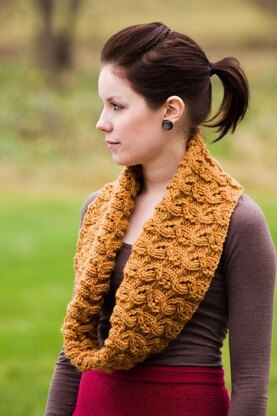 Winter Wheat is a chunky cowl worked in the round with easy-to-memorize cable pattern. It can be worn wrapped around your neck once or twice.