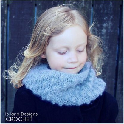 Crocheted using soft fingering, sport or DK weight yarn of choice. Sample cowl used a fingering weight angora wool blend and crochet hook size H (5.0 mm).