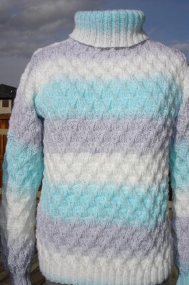 This beautiful pattern will keep you knitting all day. It is such a fun pattern to work on and it is so beautiful. It looks so hard to do but is really quite easy. Wear this on your cold days coming up this Winter and you'll be cozy warm. You can use any worsted weight yarn in solids or use striped as shown. Either way you will make more than one. You can wear this to work or as your weekend getaway. Small takes 4 balls 1135 yards and Medium and Large take 5 balls 1420 yards. Use Ice Yarns or even Plymouth Encore Colorspun, Mary Maxim or any worsted weight will do. Make it solid or multi as shown.