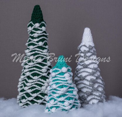 Winterland Christmas Trees are exquisitely textured by crocheting a garland style concept using only 4 rows of stitches. The garland is then spiral wrapped around a Styrofoam cone. This crochet technique creates a wavy effect, representing the branches of a Christmas tree. With an increased/decreased stitch count, this technique can be used on any size cone to suit your Christmas tree size. Acrylic yarn is recommended for this pattern, because of the stretchiness of the yarn.
