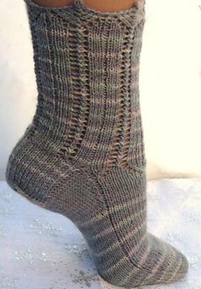 These pretty socks were inspired by the first snowfall of winter. The cuff features a decorative edging incorporating bobbles in the initial round. The lace of the edging continues into the leg but stops at the instep to ensure comfort over the foot. These socks are worked from the cuff down in a fingering weight yarn.