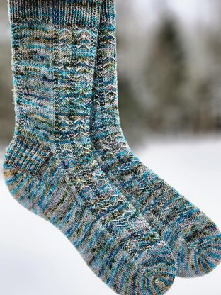 Winter is not my favourite season, but there are magical days that are just perfect. The snow is sparkly on the trees and underfoot. The sky seems a more intense blue than in summer. The stitch pattern evokes the pine trees and the walking trails that I love to walk and listen to the birds singing as my boots crunch over the snow.