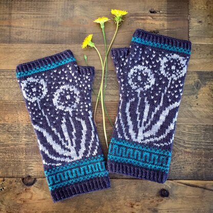 The design of these fingerless mitts was inspired by the dandelion's seed stage, commonly associated with wishmaking. A wide graphic panel on the back of each mitt wraps around to meet a narrower panel along the palm side of the mitt. This pattern is recommended for knitters who have experience with stranded colorwork, reading from charts, and knitting in the round. The mitts shown were knit with Magpie Fibers Domestic Fingering in colorways Baby Got Black, Tidepool, and Alloy.