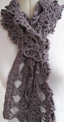 A lacy crochet scarf that grows very quickly and takes only one 100g skein of 4 ply/fingering weight yarn. As made to the pattern the scarf measures 30cm wide by 200cm long when blocked. A skinny version approx. 15cm wide would take half a skein or 50g of 4 ply/fingering weight yarn. A stole approx. 45cm wide would take 150g. The pattern is easily adapted to any width or any length. Alternatively it can be adapted to any weight of yarn provided you use a suitable hook size. An example of a skinny scarf in Rowan Savannah (aran weight) using approx 125g is also included. Written in English and US crochet terms