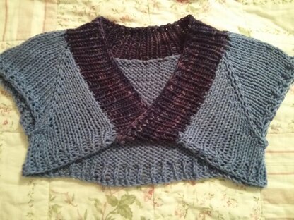 I came up with this design when wanting a quick and easy sweater to use up a minimal amount of yarn. The result is a simple, yet flattering sweater. The perfect sweater to cover up your shoulders when it is cooler outside. Can be knit in one or two colors.