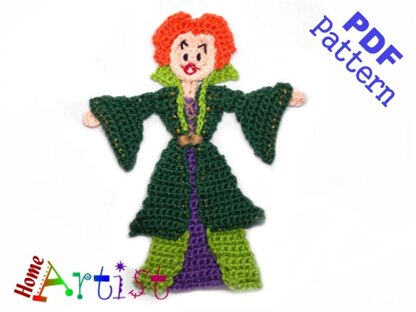 Witch Sisters 1 measures about 6 in. in height by 5 in. wide but the size can be varied by using thinner or thicker yarn and types of hook. Colors can be changed according to your personal preference. The pattern is designed for worsted weight yarn and uses American English crochet terms.
