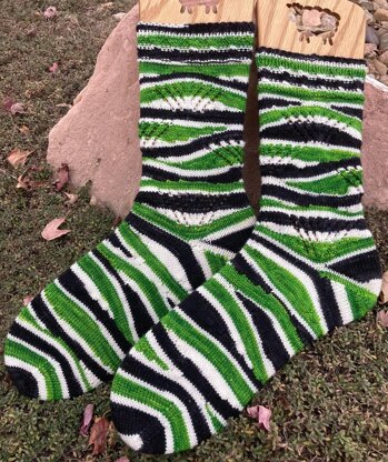 A cabled "broom" cuff and short-row shaping with pretty lace to bend self-striping yarn and make it dance.