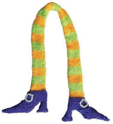 Use this fun Fall knit as a scarf or Halloween decoration. A front and back are knitted and sewn together with quilter’s batting to create this Silly Scarf. It can be made longer by increasing the orange/green “sock” sections, if desired.