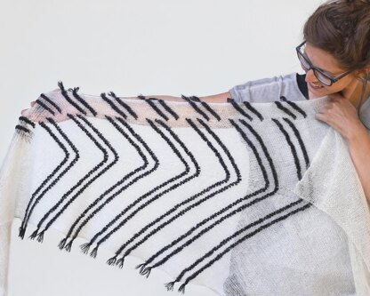ITO’s soft lace weight mohair yarn, Sensai, forms the body of the shawl, while ITO’s fingering weight yarn, Rakuda, forms the striking bulky garter stripes. The Navajo knitting in the garter stripes adds a touch of challenge to an otherwise relaxing knit — but this is approachable enough. The photo tutorial will guide you through the technique step-by-step.