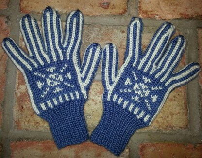These gloves are knit in a round on double point needles in the double knit stitch. They are knit in two colors with a design on the back of the hand. The body and fingers are knit in a faux rib stitch that holds the double thickness of the fabric together. They are extra warm!