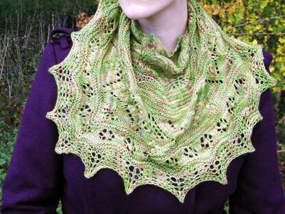 A triangular small shawl is given an extra wedge and an unusual pattern of increases, creating ruffles and pleats in a garden of flowers, a scant scattering of nupps, and some stable, trustworthy garter stitch.