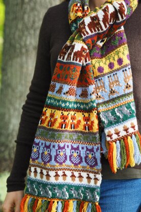 Woodland Critters scarf is the capstone project for the Woodland Critters collection. It combines most of the animal designs with flowers, trees, and other woodsy motifs into a single tubular-knit scarf. This adorable sampler project is a great way to practice stranded knitting, duplicate stitch, and finishing techniques all in one garment. The pattern includes two versions of each chart: a complete chart, often with four colors per round, and a second chart with just two colors per round for those who choose to use the duplicate stitch method to add extra colors after knitting is complete. The pattern offers two finishing options: fringe tassels and pompoms.