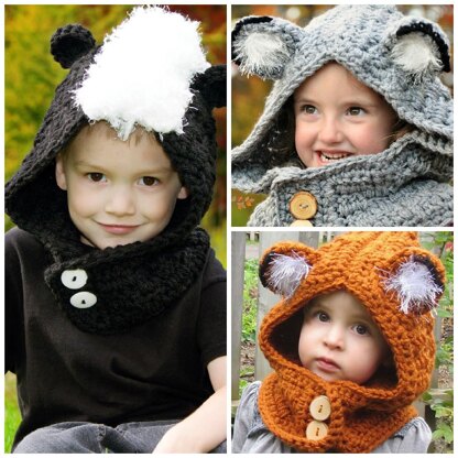This pattern includes instructions to make the Wolf, Fox and Skunk in sizes Toddler, Child and Adult. But don't let the fun stop there! Leave the details off the wolf ears and you now have a cat! Red cowl, brown ears? Looks like an Ewok! With a few color changes, your skunk is now a horse! Let your imagination run wild as you customize this cowl for anyone in your life.