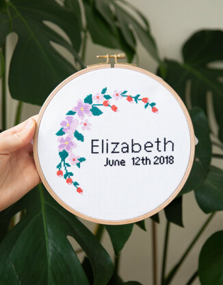 Wool and the Gang's take on cross stitch. Our all-in-one kits have everything you need to get your stitch on - from the itty bitty needle to the double mercerised stranded cotton. This cross stitch kit has a floral wreath motif, surrounding a space to customise your project with a name and date (hello, baby shower gift!).