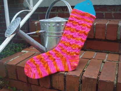 This happy bright sock is worked toe-up in the magic loop style with a short-row heel. Detailed instructions with pictures are provided for the provisional cast-on and the toe-up construction. It has charted and written instructions for the lace pattern, and is offered in two sizes, a 56-stitch and a 70-stitch count. The 70-stitch count sock fits a woman’s size 10 wide foot comfortably when worked on size 1 addis and Sugarbee Studios Sock Yarn - shown in the Cheap Date colorway. A suggested substitute yarn is shown below.