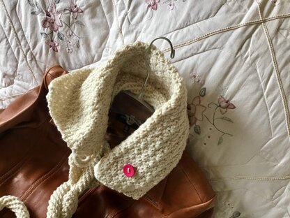 Special buttoned collar with unique cord design. One of a kind scarf! Simple crochet stitches throughout.