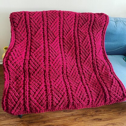 THIS IS A LOOP YARN FINGER-KNITTING PATTERN. The Woven Columns Blanket combines columns of parallel lines and ribbing to create an elegant Art Deco-inspired design.