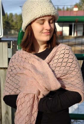 This is a pattern for a knit wrap that is worked from side to side. On one end there is ribbing that makes a loop for the other end to be threaded through when wearing to help hold it in place without a shawl pin. The body of the wrap is an intricate, yet simple lace pattern surrounded by a garter stitch border.