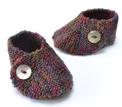 This baby shoe pattern comes in two sizes: 0-3 months (8cm long) and 3-6 months (9-10 cm). It uses a doubleknit wool, and if you chose something with a percentage of mohair or alpaca, they will have a fluffy almost felted look.
