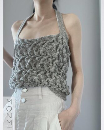 The idea behind wrinkle top is feel casual when knitting just like not ironing the wrinkle linen shirt when wearing. The way garment structures allows it can go easier on knitting density and blocking. Top features uneven bumpy textured surface, neck- hang strap and wide hem.