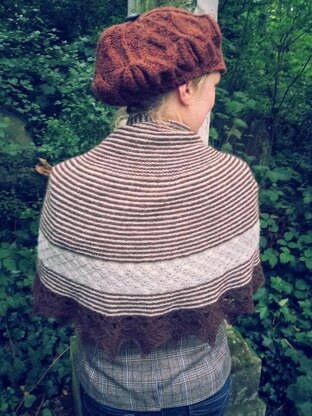 This half-circle Pi shawl, inspired by the rugged Ilkley Moors and ill-fated Victorian heroine Catherine Earnshaw, combines an easy but striking striped garter-stitch base with a small section of densely worked purl shells and a delicate lace edging that uses a traditional Estonian gather and expand technique. Knit in one-piece from the top-down in beautifully soft and warm Alpaca, it is ideal for snuggling up on chilly winter evenings. Pattern is charted and rated as moderately difficult.