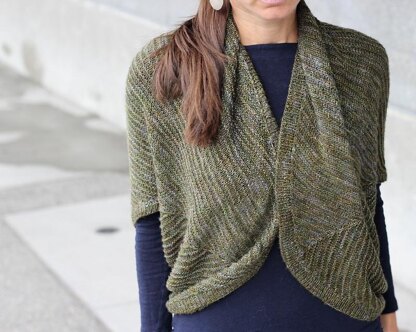 The cardi is worked on the bias, with no long cast on or bind off - smart shaping ensures proper fit. That’s right - no cast on or bind off! No fiddling with gazillion stitches! The fabric uses a simple garter ridges to highlight this new and absolutely unique seamless construction.