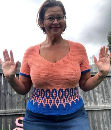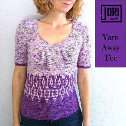 Yarn Away Tee is made top down in one piece. It is designed to have a tight fit on the bust, it has an exact fit on the given bust measurements. This tee does not have waist shaping. This pattern contains detailed description with pictures and a video tutorial on the mosaic.