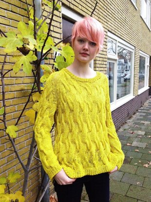 Use your softest, drapiest yarn to create this stunning cable sweater. The cables are softly defined, appearing almost to run into one another, without the traditional purls in between. It's a loose-fitting sweater with raglan shoulders and the very actual hi-lo hem. Knit it up in a bold actual color or keep it neutral …either will work great with this new classic….