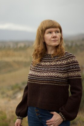 This sweater is worked in one piece from the top down with a circular yoke construction. Sleeves and body are separated at the underarm. Short rows are used to raise the back neck and to shape the lower hem of sweater. A straight sleeve option is also provided. Other variations on sleeves could include a capped sleeve or ¾ length sleeve, both of which are easy modifications to make.