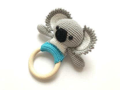 Cute teether crochet pattern for Yooki Koala. Real life wild koalas preferably hang out in trees, but Yooki would rather hang on to you. If Yooki seems a little shy, just try and feed it some eucalyptus leaves.