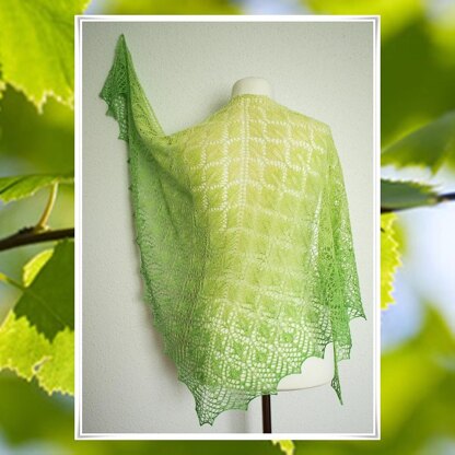 Details to the shawl on the picture: Yarn: 600m/100g Gradient Yarn Lace Merino/Silk, color ‘Granny Green’ Needle size 4mm