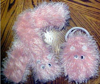 A very cute set, with eyes! Call it a cat, call it a mouse, whatever you wish! No mouth, just eyes and ears, so let your imagination go wild! Use different colors, for different effects. Use fur yarns, and knitting needles, US #9 and # 10. This is a very quick gift idea! And they sell very well at bazaars and craft sales. Remember to buy the google eyes that are available at most hobby and craft stores, and some fabric stores. You can knit the entire set in an afternoon! Purse is little girl sized, 6 by 7 inches, scarf, is 3 ½ wide and 45 inches long. With large needles, it works up fast. A small amount of yarn for ears and purse handle. Girls will giggle with delight when they see this set!