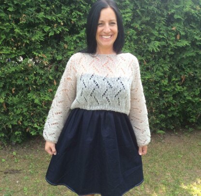 This cropped lace sweater, knitted with a yarn mohair style, very light (the finished model weigh about 80 gr) will warm your shoulders up for the summer evenings.