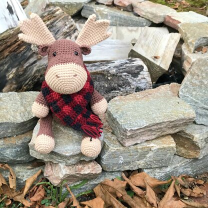 Meet Yukon the Moose! He's loveable, huggable, and gives all the warm feelings a Northern winter friend can bring. Yukon has two buffalo plaid accessories - a vest and a scarf. He is easy to work up and makes a perfect gift. Your PDF purchase includes written instructions with a photo tutorial. You'll need the yarn colors pictured (worsted/aran weight), a size E/3.5mm crochet hook, a yarn needle, stuffing, 9mm safety eyes, 20mm doll joints (optional), and an intermediate crochet skill level (or give it a try if you're an ambitious beginner!). The finished moose is about 9 1/2" tall when sitting, 13" when outstretched.