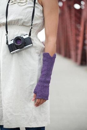 [1]: Knit from the top down (upper arm to finger edge), the Yvonne armwarmers work up fast using simple stitches. Pattern is established by first working flat (in rows) and then transitions to working in the round. Garter stitch runs along the length of these gloves breaking up the otherwise smooth stockinette piece.