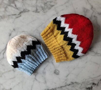 Is there anything cuter than a baby in a handknitted hat? A baby AND a toddler in handknitted hats! These hats let you personalise with favourite colours above and below the black and white chevron stripes; perfect for having a similar look without being too matching. Design The hats are worked flat, on 3.5mm/US4 knitting needles, and are seamed when finished – an edge st is worked as a seam allowance. Only two colours are used at any one time, so they are an ideal introduction to bold colourwork. The pattern was first published in the UK magazine 'Your Knitting & Crochet' and a colourwork chart and written instructions are provided.