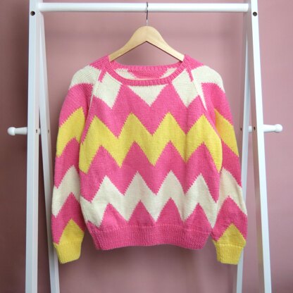 This simply shaped raglan jumper features a bold zig zag design, which can be worked in any colour combination you choose. It is worked flat from the bottom up and uses the intarsia method for the colour work. Techniques include knit and purl stitches, intarsia colour work from a chart, increases and decreases and picking up stitches.