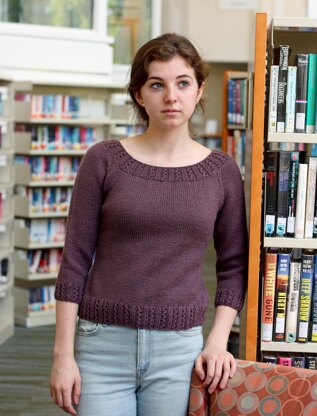This cute little 3/4 sleeve raglan pullover, features a zig zag rib at hem, cuff and neck. The body features fully fashioned shaping