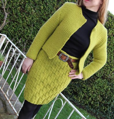 The Zig Zag comprises a box type fitted jacket knitted in Garter Stitch and a skirt knitted in a simple zig zag stitch pattern using knit and purl stitches. Both are knitted in Hayfield Bonus Chunky yarn. The suit is very simple and quick to knit. I have finished off the jacket collar with a simple crochet stitch.