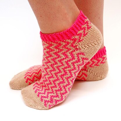 Once the toe part is shaped, we move to the fun part – working in a zigzag colour pattern. It might look intricate and intimidating to newer knitters, but in fact, it is the easiest way to make two-colour stranded pattern. The pattern provides lots of tips and links to step-by-step tutorials that make this zigzag pattern very easy and fun to make.